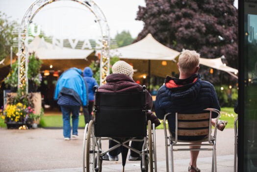 A photo of two people sat in front of a marquee in the rain, watching a community event at Under Canvas Festival, Eden Court
